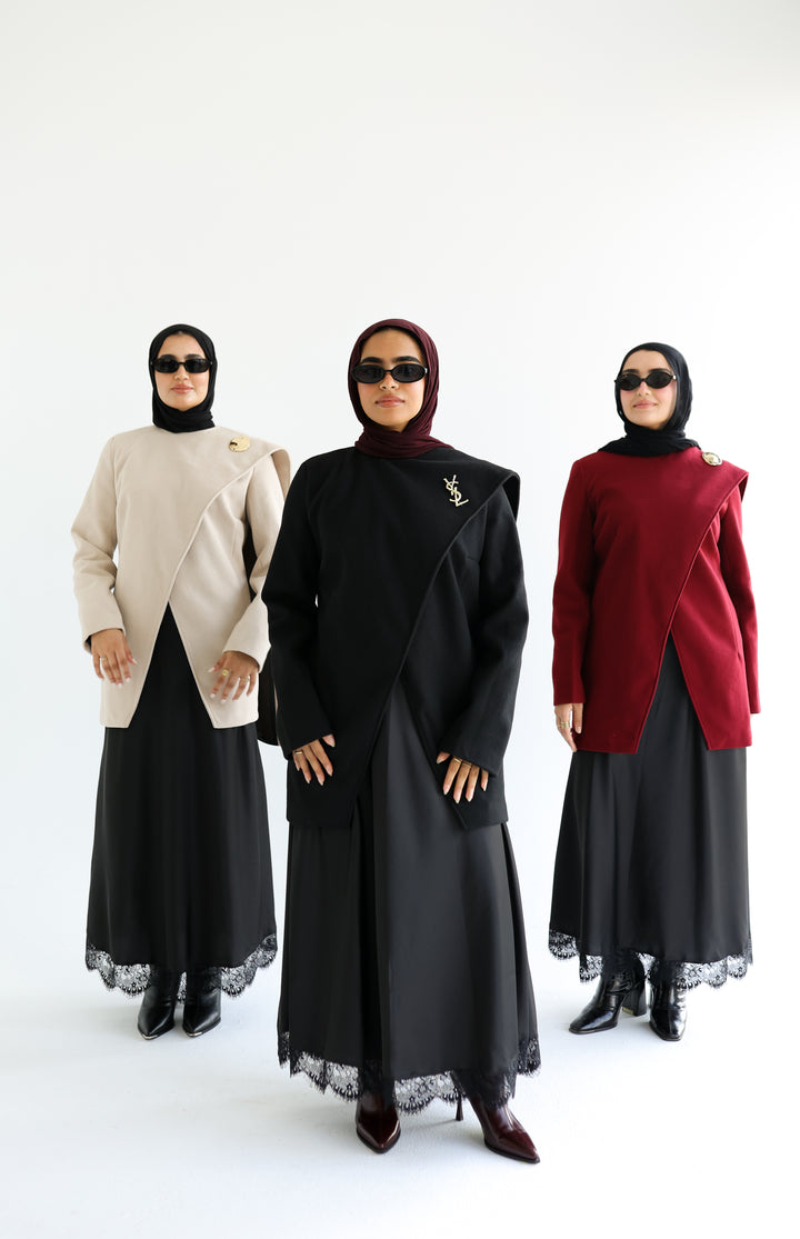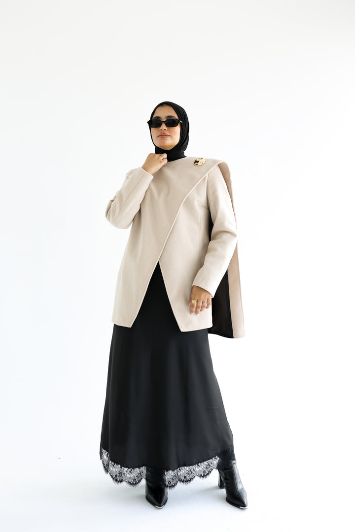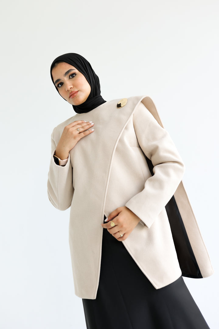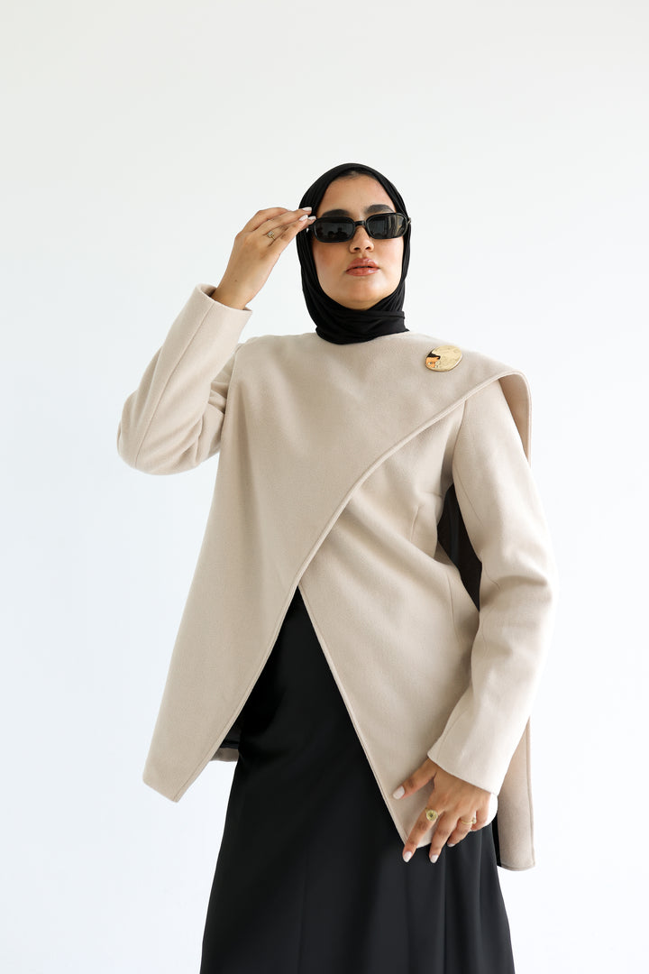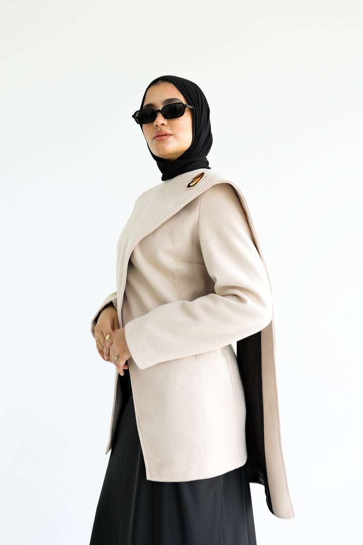 (without a brooch) A padded jacket with an attached scarf and a clean back zipper. Warm, minimal, and perfect for everyday winter wear.