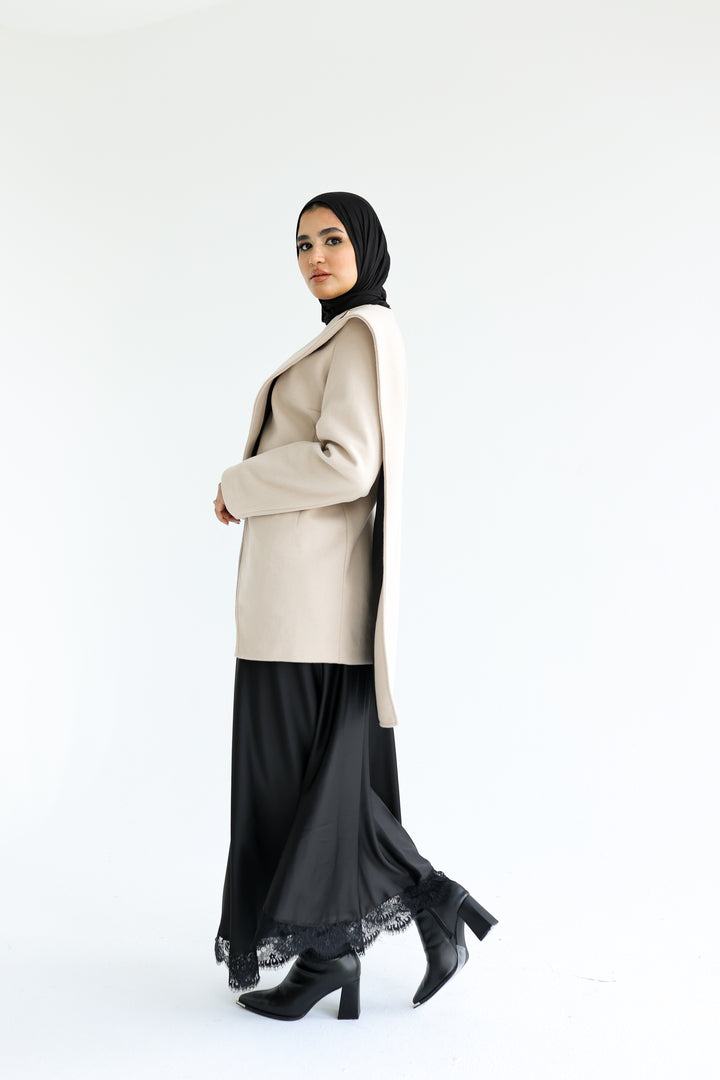 A padded jacket with an attached scarf and a clean back zipper. Warm, minimal, and perfect for everyday winter wear.