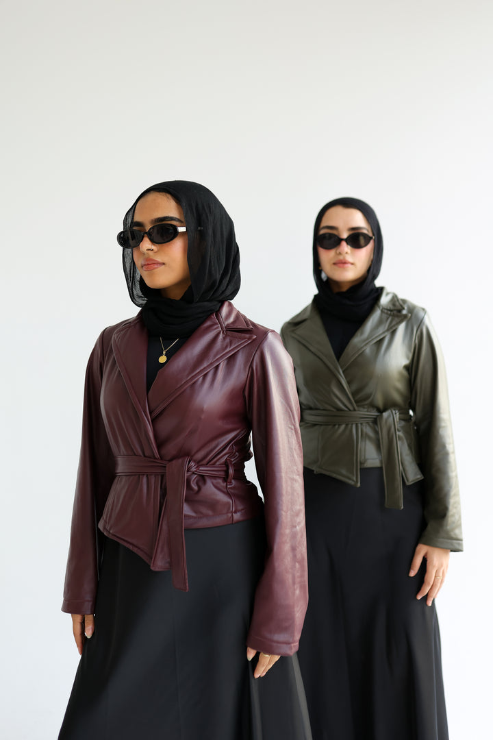 Short padded faux-leather jacket with an open front and waist belt in an elegant .