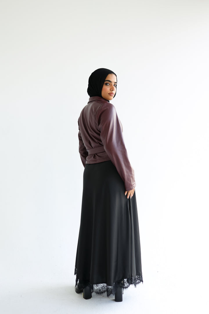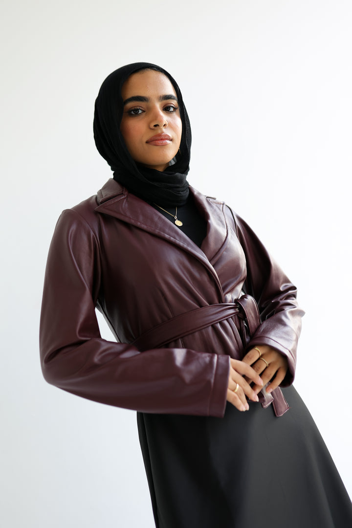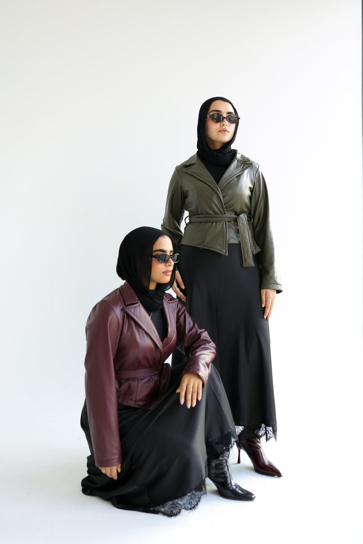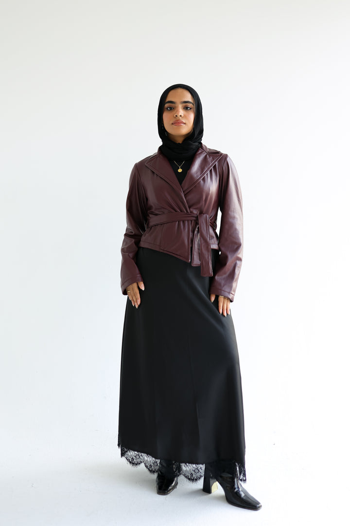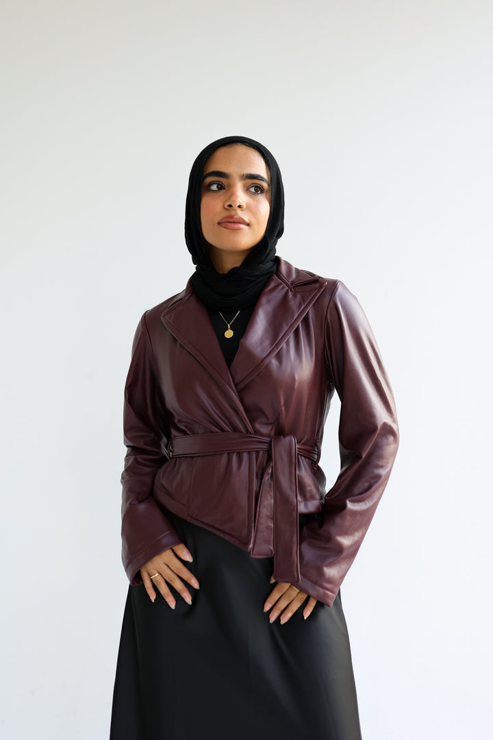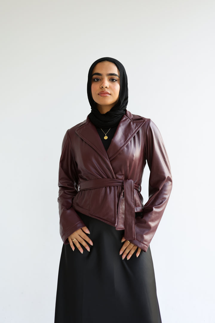 Short padded faux-leather jacket with an open front and waist belt in an elegant .