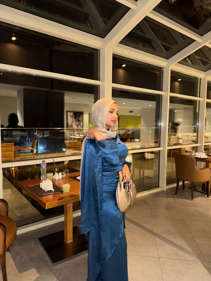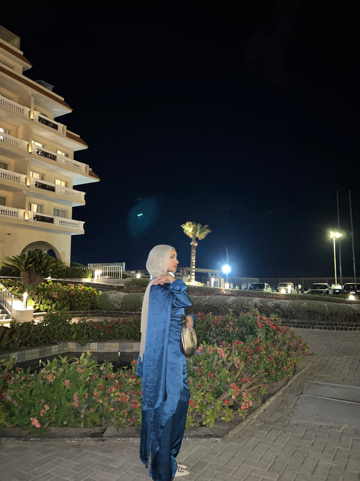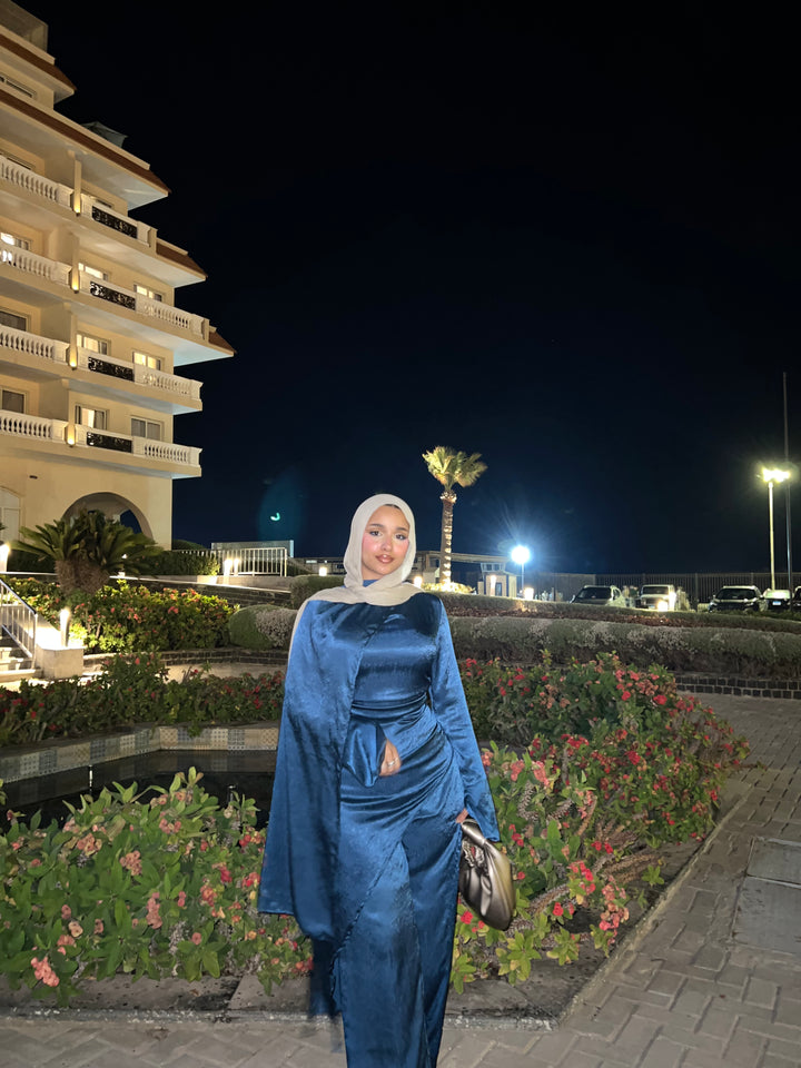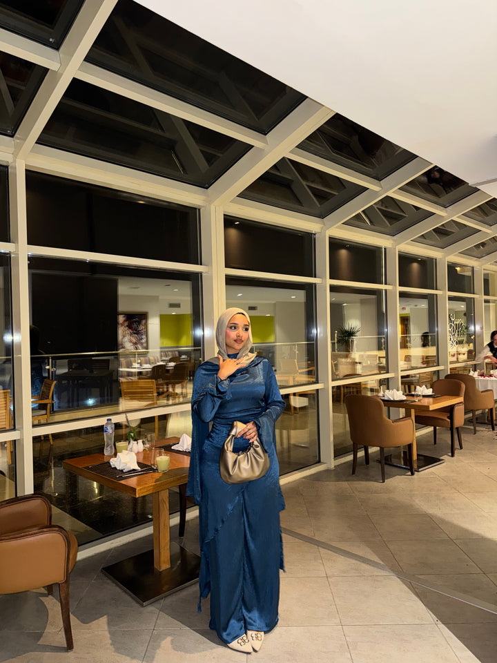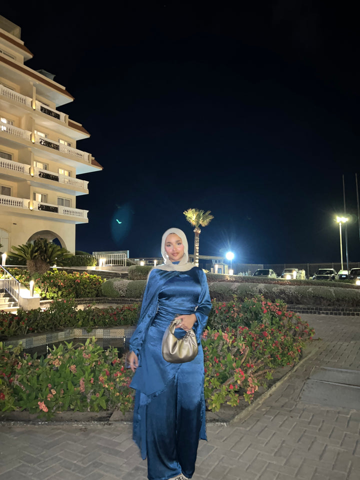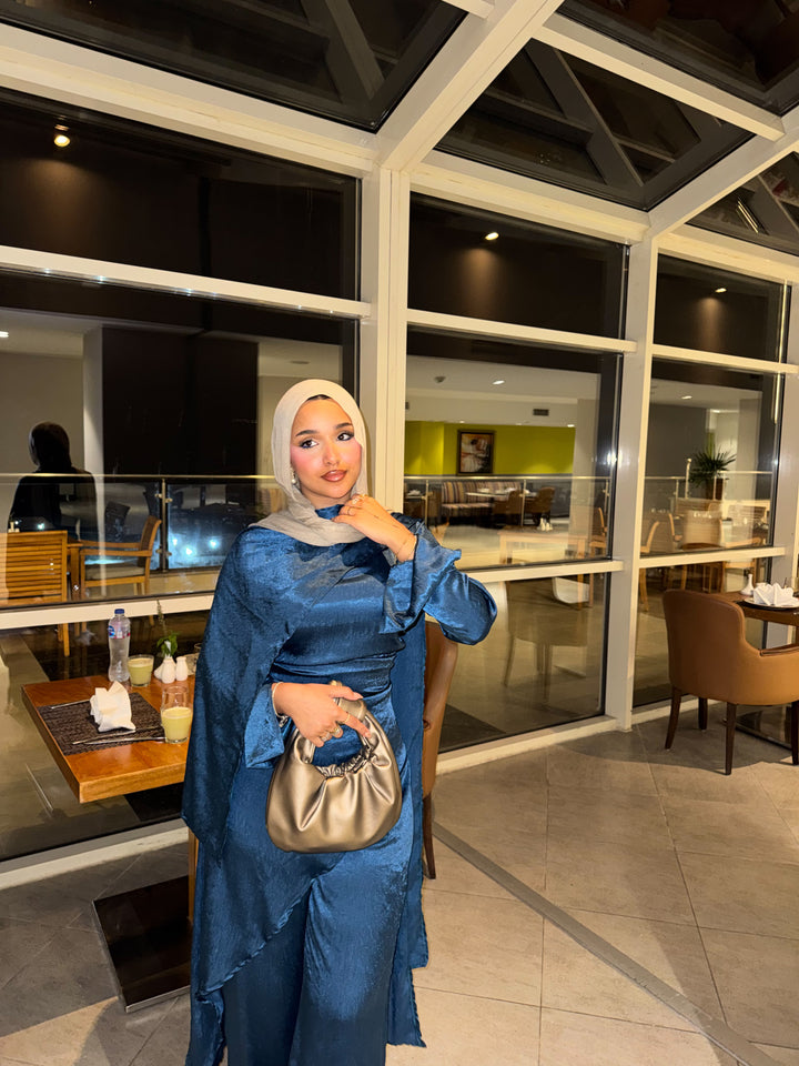 This Set consists of three pieces: wide-leg pants, a blouse, and a separate shawl. The material is satin silk, giving it a smooth and elegant finish.