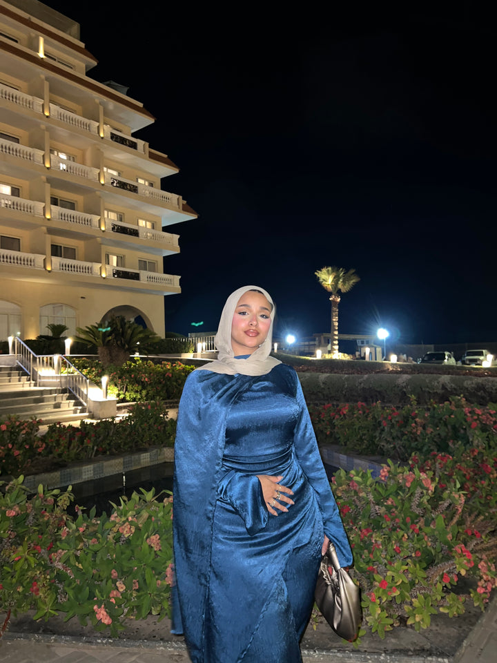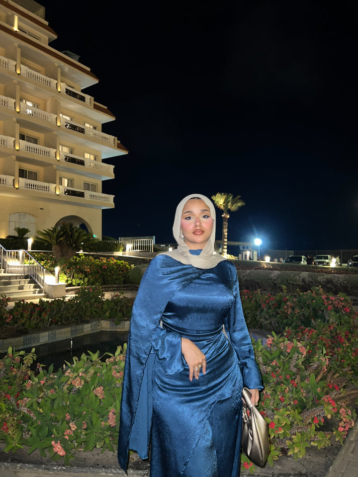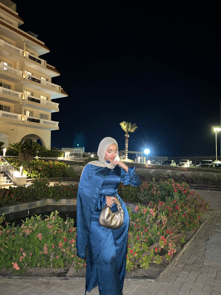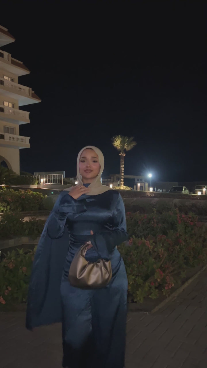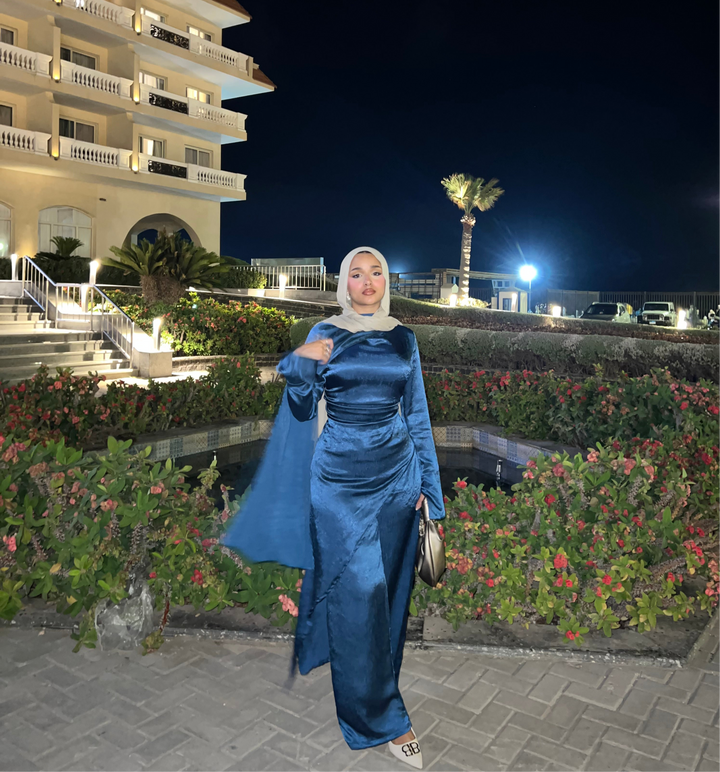 This Set consists of three pieces: wide-leg pants, a blouse, and a separate shawl. The material is satin silk, giving it a smooth and elegant finish.