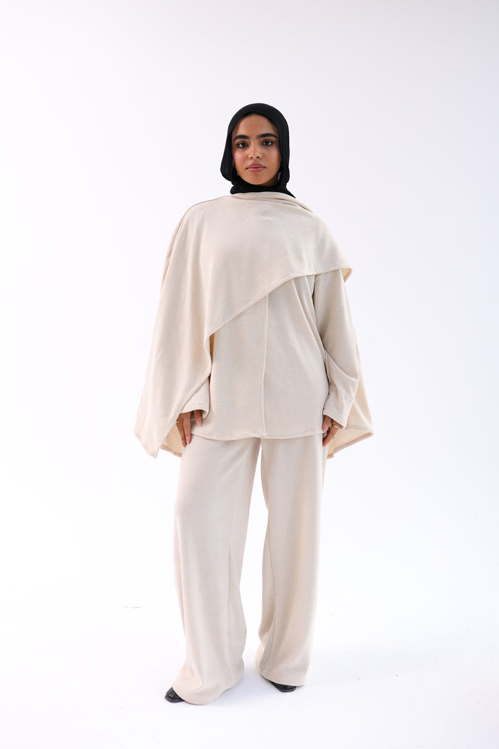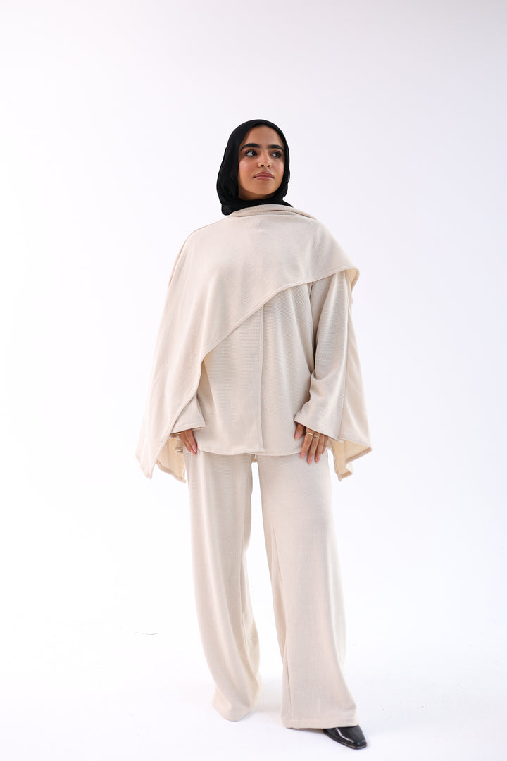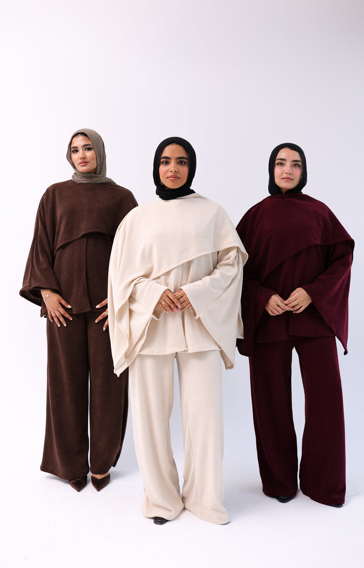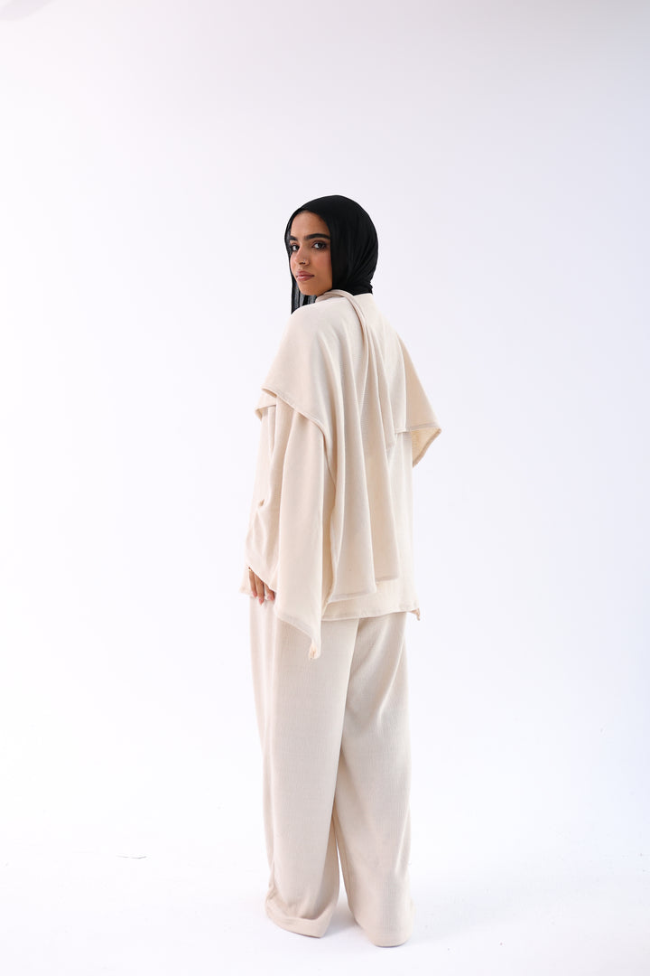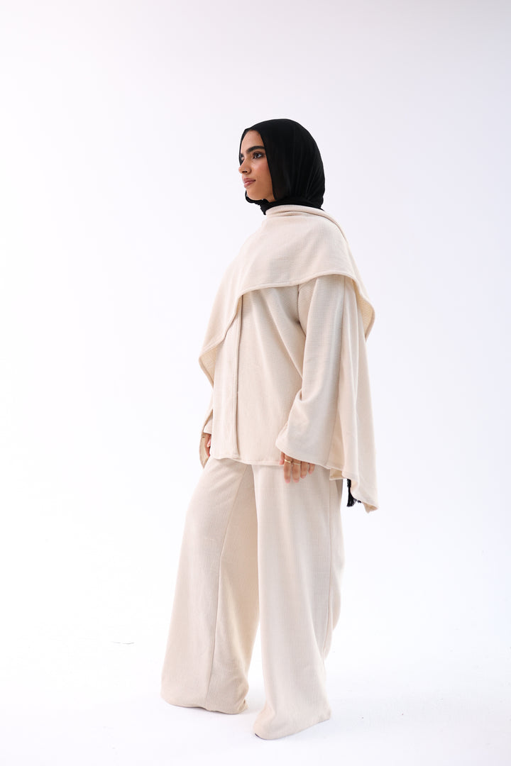 (Ove size )Soft, elegant two-piece set featuring a loose top with an attached shawl and wide-leg pants. Made from ultra-soft, warm fabric for a cozy winter feel with a modest, flowy cut.