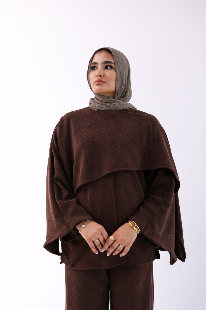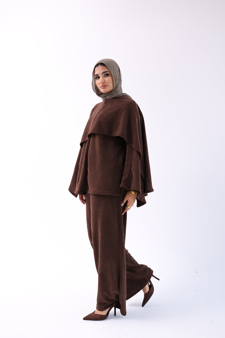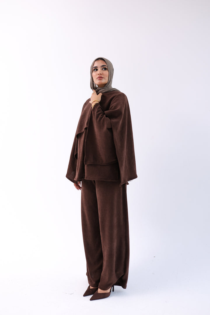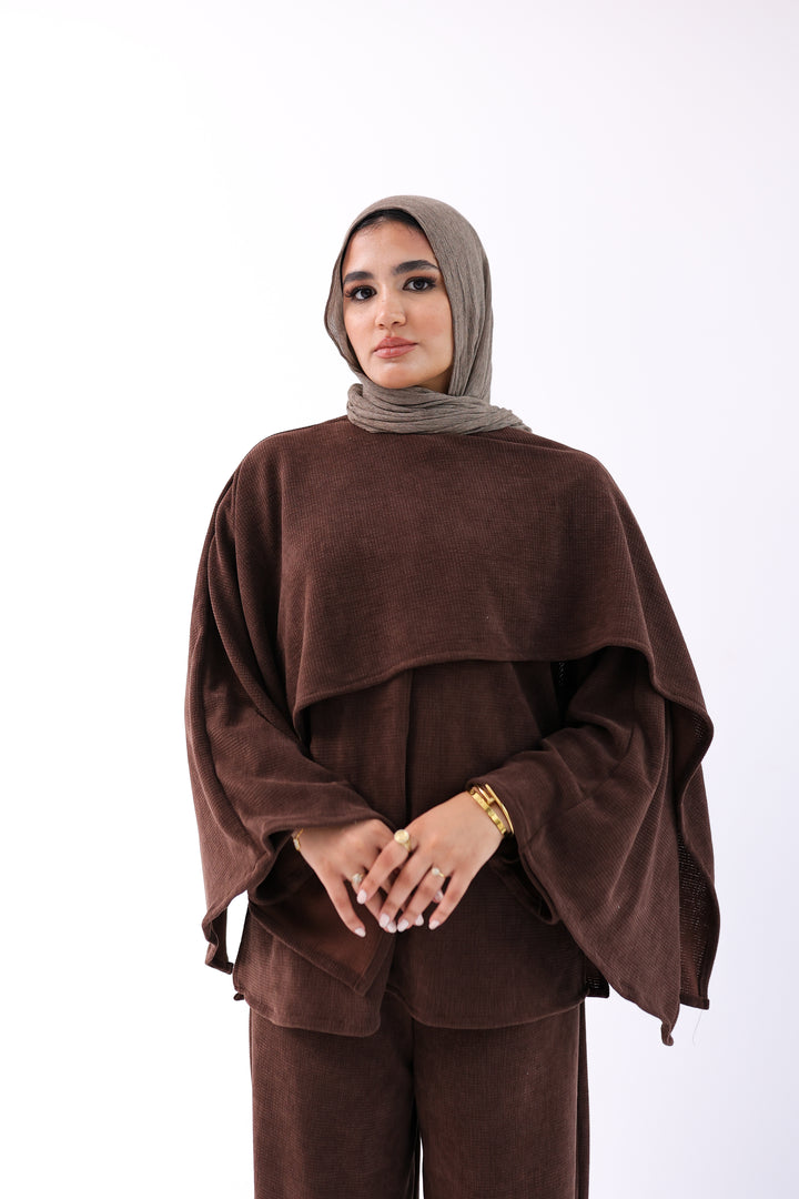 Soft, elegant two-piece set featuring a loose top with an attached shawl and wide-leg pants. Made from ultra-soft, warm fabric for a cozy winter feel with a modest, flowy cut.