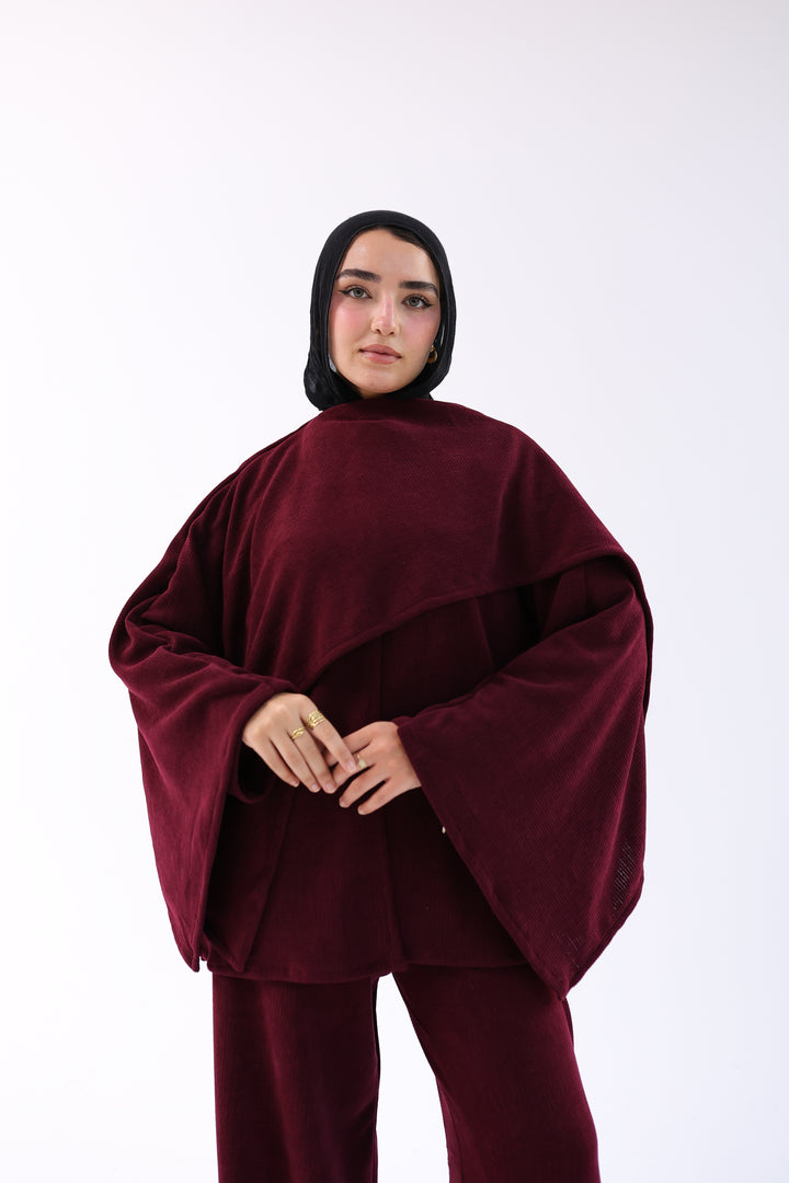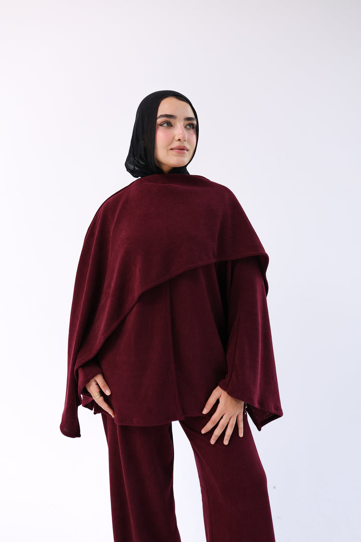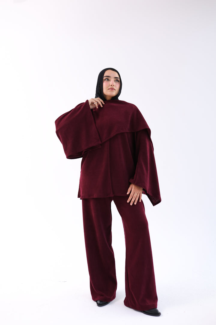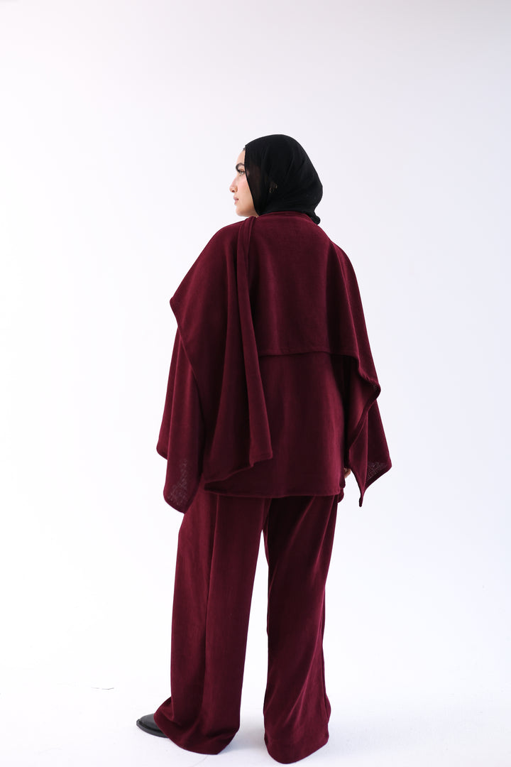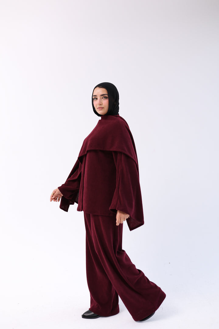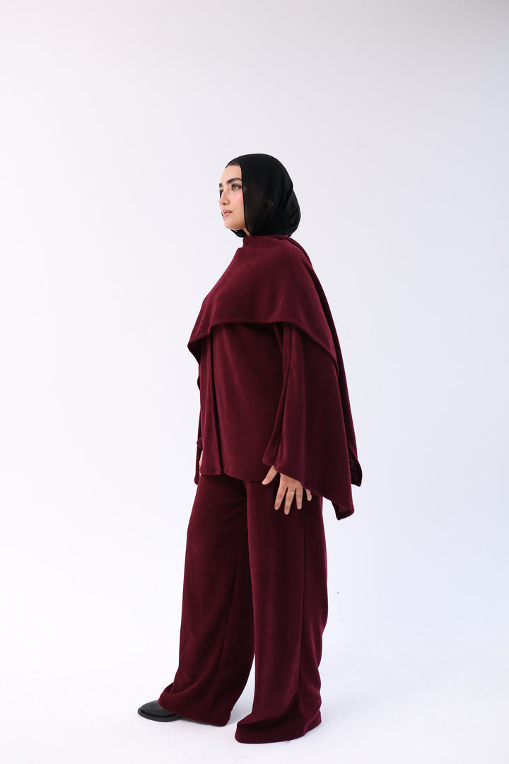 (Over size )Soft, elegant two-piece set featuring a loose top with an attached shawl and wide-leg pants. Made from ultra-soft, warm fabric for a cozy winter feel with a modest, flowy cut.