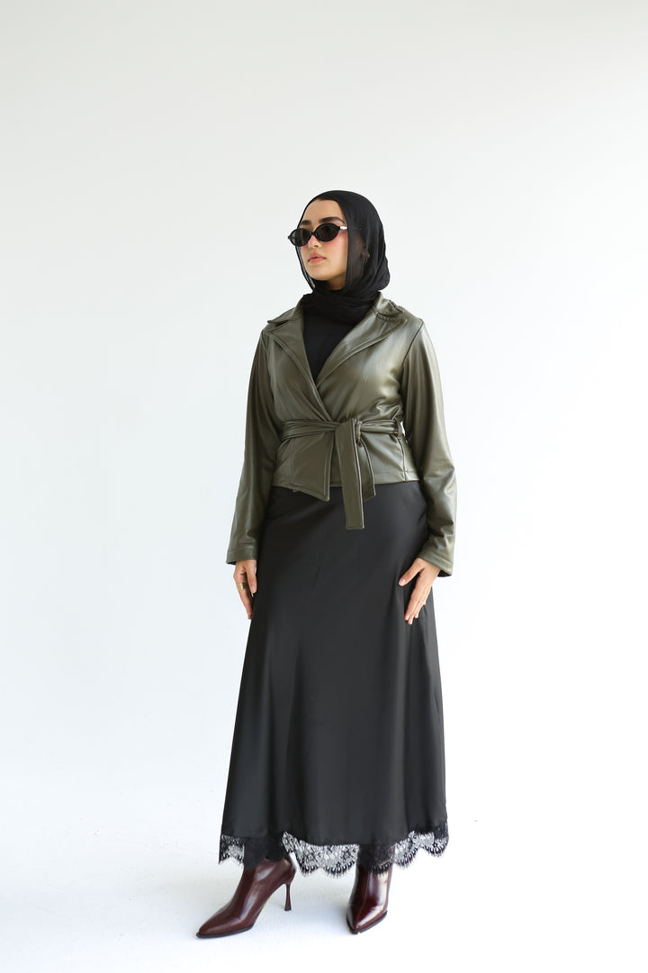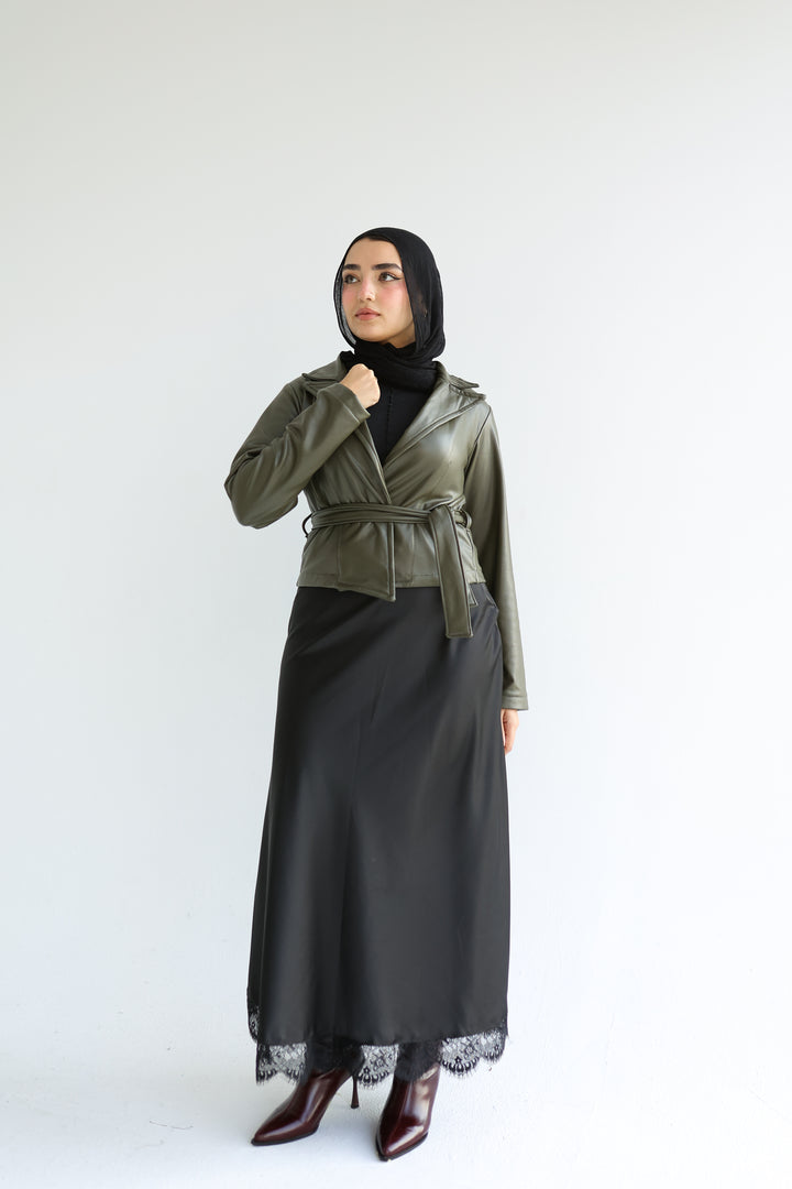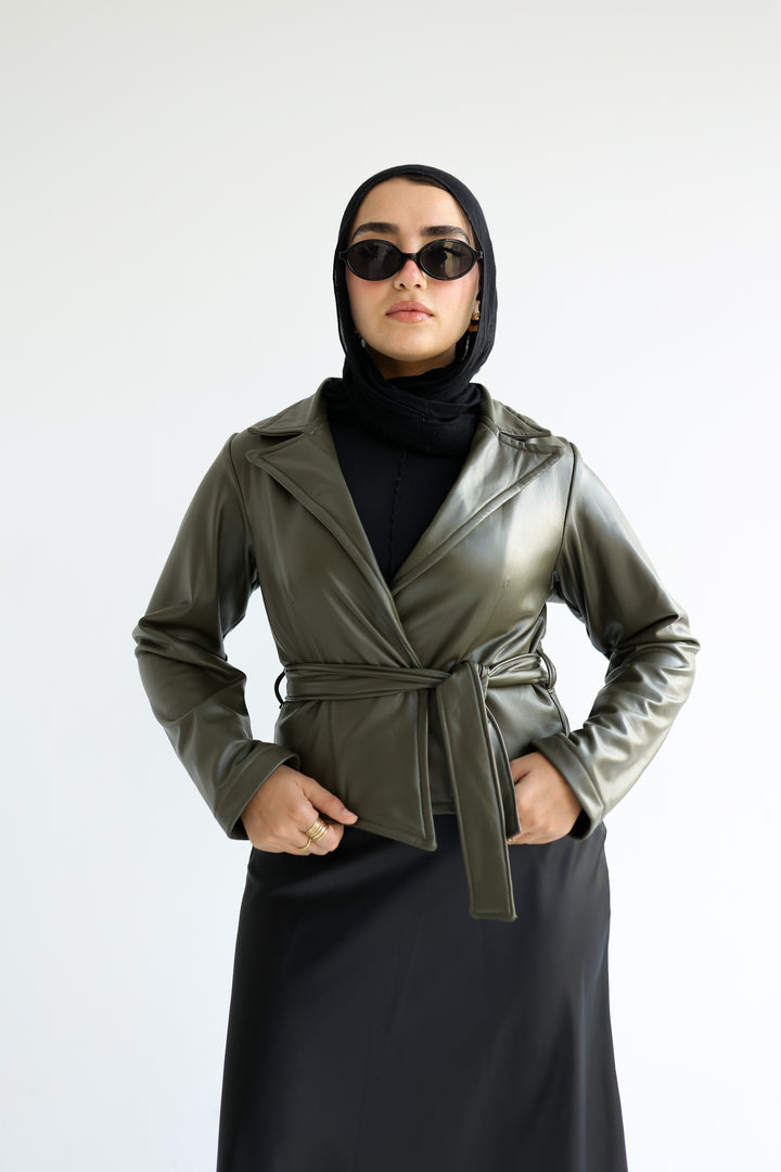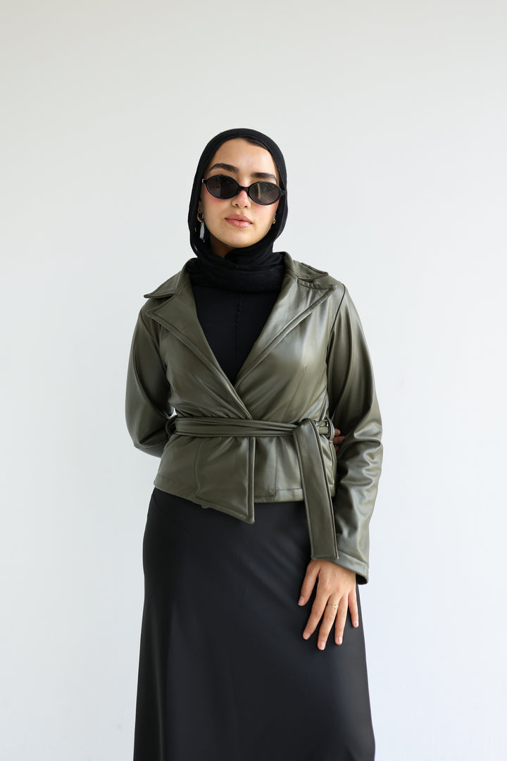 Short padded faux-leather jacket with an open front and waist belt in an elegant .