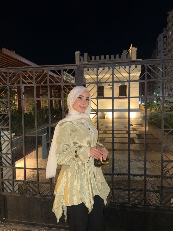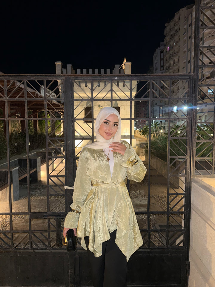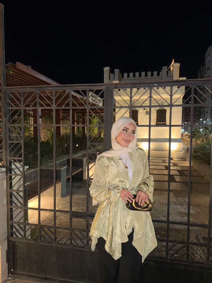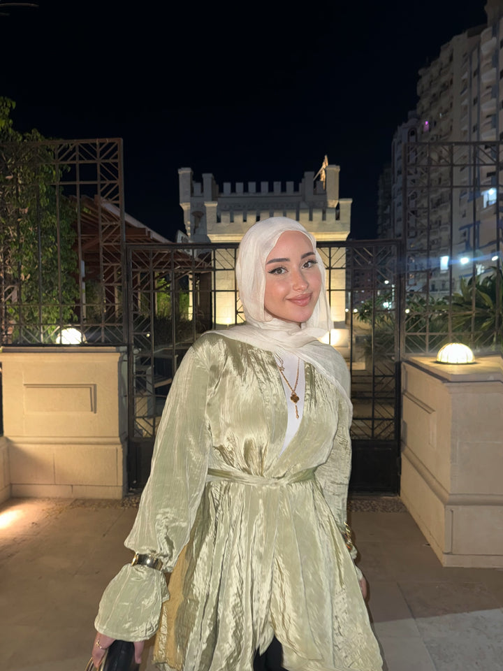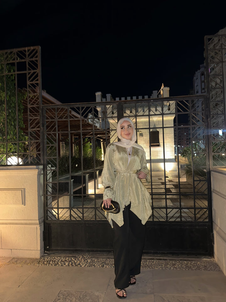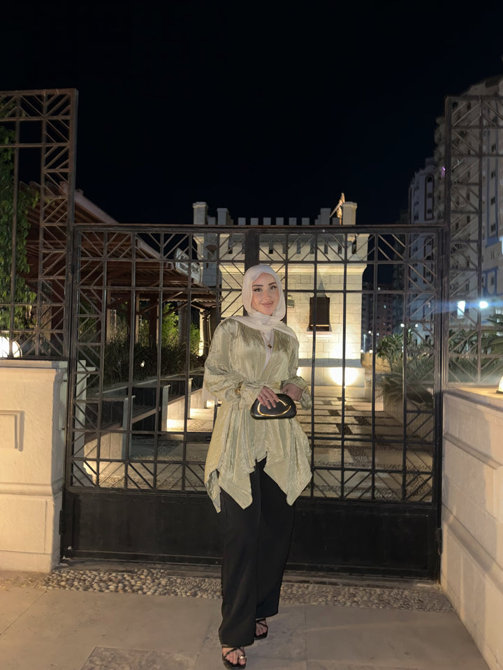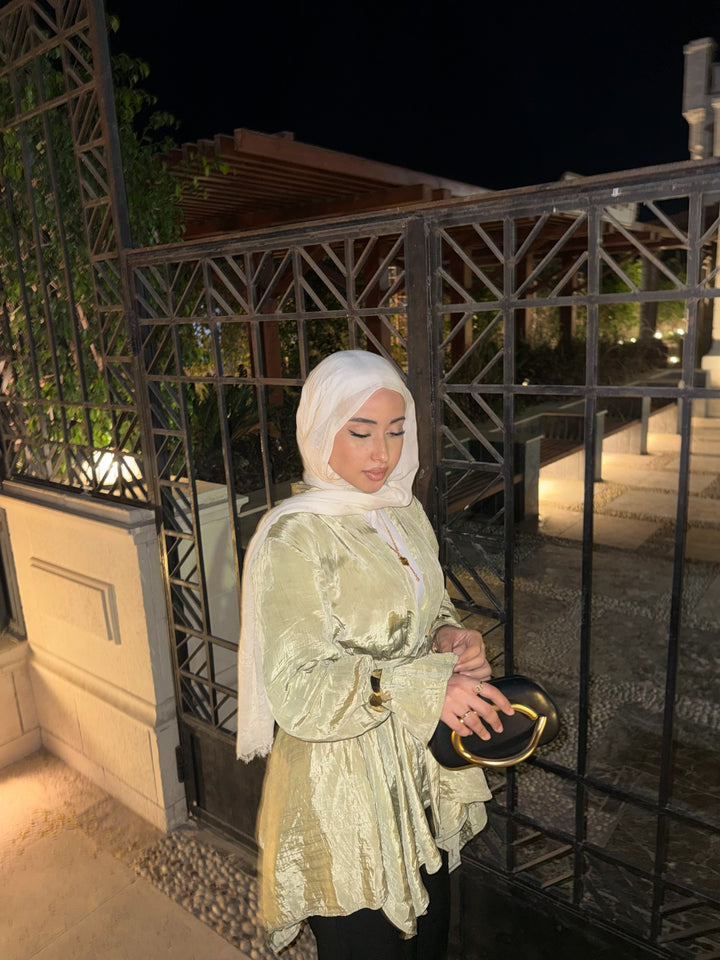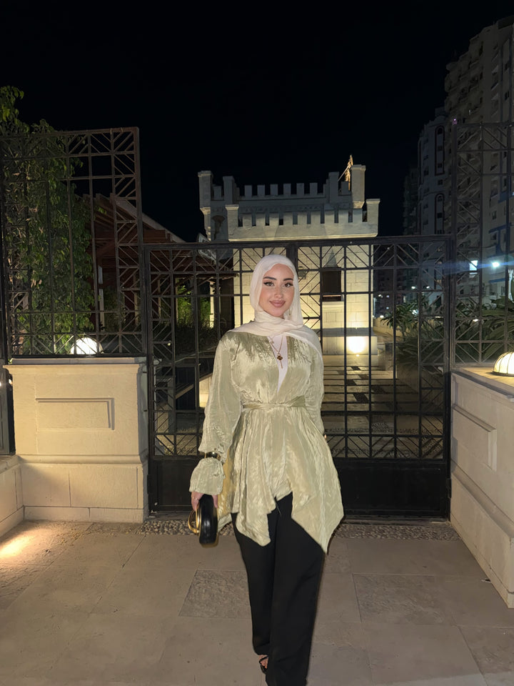 Satin wrap blouse with tie waist and flowy sleeves in sage green.